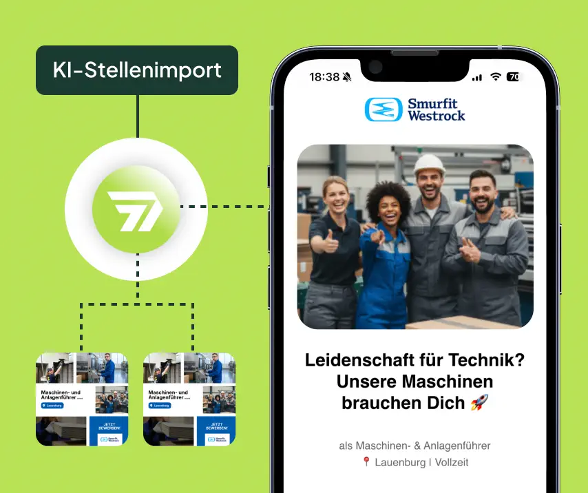 Fynd erstellt automatisch hochwertige Social-Media-Ads und mobiloptimierte Jobseiten, die Ihre Arbeitgebermarke ins beste Licht rücken – und besser konvertieren.